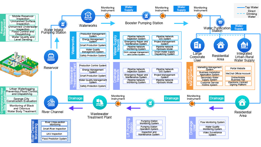 Smart water construction products and services cover urban water supply systems from "source to tap", including water sources, water plants, pipelines, and secondary water supply. Leveraging technologies such as cloud platforms, big data, and IoT, it integrates water application subsystems including SCADA, GIS, DMA, water quality monitoring, billing, secondary water supply systems, pump station monitoring, security video, production automation, water application, customer service systems, asset management, and OA. This eliminates information silos and data chimneys, achieves data sharing, establishes a collaborative operation management model, reduces accident risks and enterprise operational costs, and supports corporate decision-making.